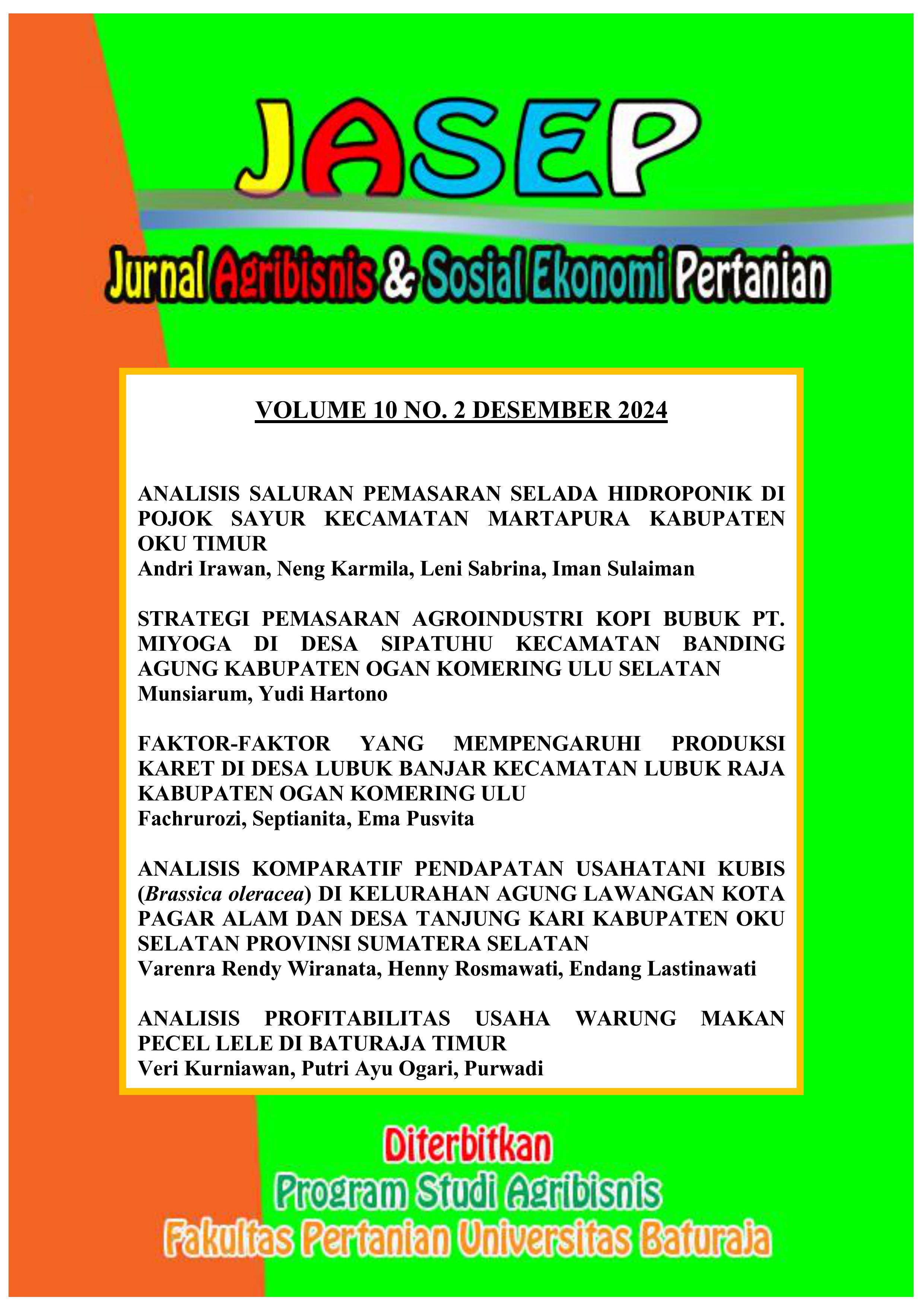 Vol. 5 No. 1 (2019)Analysis of Minimum Land Area to Meet the Needs of Wet-Rice Farmers in Beras Mulya Village, Buay Madang Timur District, East OKU Regency. This research was conducted in Berasan Mulya Village, Buay Madang Timur District, East OKU Regency. The method used in this research is survey method. The sampling method used is Disproportionated Stratified Random Sampling. The number of samples taken as many as 30 rice farmers. The results of this study indicate that (1) rice farmer income with land area of 0.25 Ha of Rp. Rp. 3.852.750 / mt, farmers with land area 0.50 Ha earn revenue of Rp. 7,398,220 / mt, farmers with a land area of 0.75 ha earn income of Rp. 13,037,100 / mt, farmers with a land area of 1 ha earn income of Rp. 16.791.050 / mt, farmers with a land area of 1.25 Ha earn income of Rp. 21.247.000 / mt, farmers with a land area of 1.50 ha earn income of Rp.25.525.250 / mt, farmers with a land area of 1.75 ha earn revenue of Rp. 29.366.800 / mt, and farmers with land area of 2 Ha earn income of Rp. 32.385.000 / mt. (2) expenditure of farmers with land area of 0.25 Ha of Rp. 9.559.000 / mt, the expenditure of farmers who have a land area of 0.50 Ha of Rp. 12.375.000 / mt, the expenditure of farmers who have a land area of 0.75 Ha of Rp. 14.578.000 / mt, the expenditure of farmers who have a land area of 1 Ha of Rp.16.290.000 / mt, the expenditure of farmers who have a land area of 1.25 Ha of Rp. 20,703,500 / mt, the expenditure of farmers who have a land area of 1.50 Ha of Rp. 20.699.000 / mt, the expenditure of farmers who have a land area of 1.75 Ha of Rp. 23.106.500 / mt, and the expenditure of farmers who have a land area of 2 Ha of Rp. 26.684.000 / mt. (3) The minimum land area that farmers must cultivate to fulfill their needs is 1 Ha.